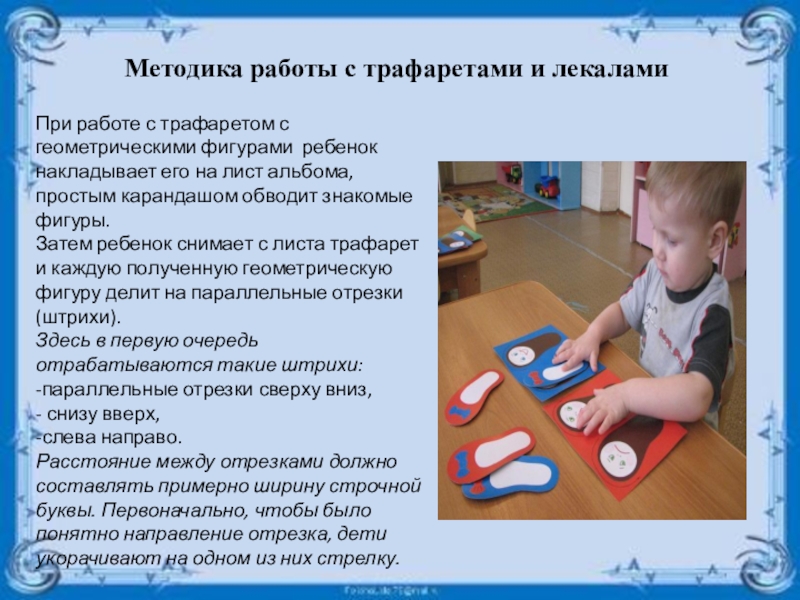 При работе с трафаретом с геометрическими фигурами ребенок накладывает его на