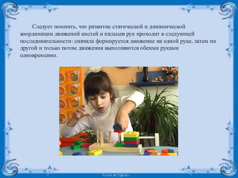 Слайд 4 Следует помнить, что развитие статической и динамической координации движений кистей и