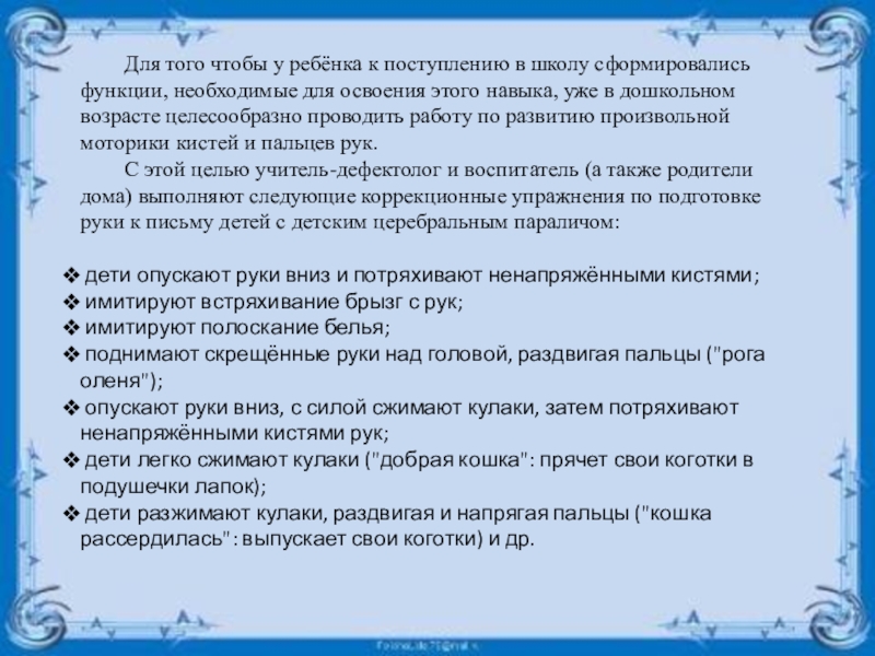 С этой целью учитель-дефектолог и воспитатель (а также родители дома) выполняют следующие коррекционные упражнения по подготовке руки к письму детей с детским церебральным параличом: