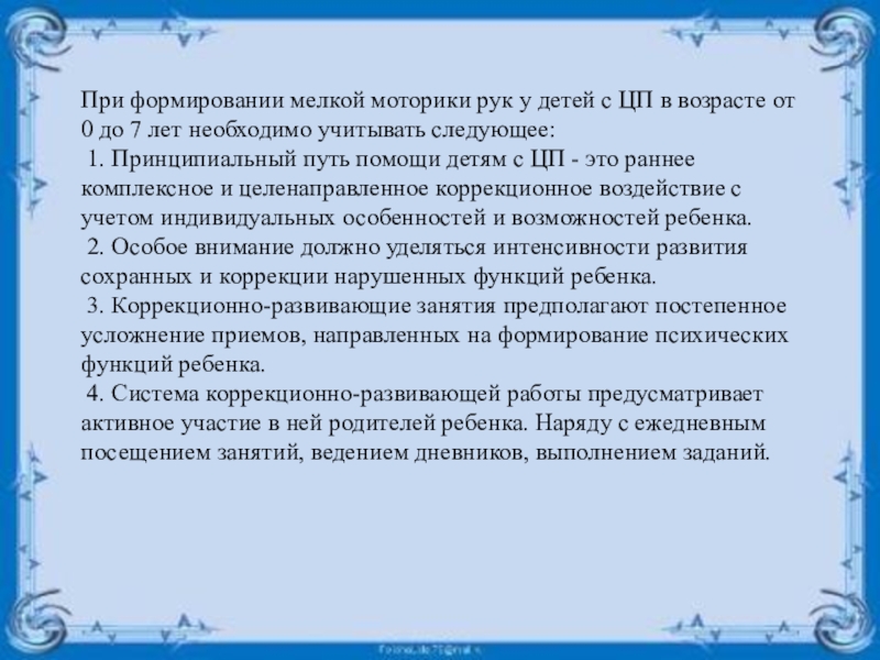 1. Принципиальный путь помощи детям с ЦП - это раннее комплексное и целенаправленное коррекционное воздействие с учетом индивидуальных особенностей и возможностей ребенка.