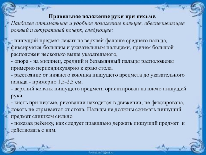 - пишущий предмет лежит на верхней фаланге среднего пальца, фиксируется большим и указательным пальцами, причем большой расположен несколько выше указательного,