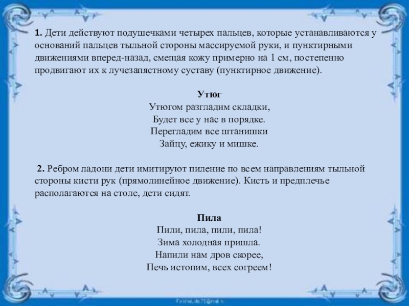 2. Ребром ладони дети имитируют пиление по всем направлениям тыльной стороны кисти рук (прямолинейное движение). Кисть и предплечье располагаются на столе, дети сидят.