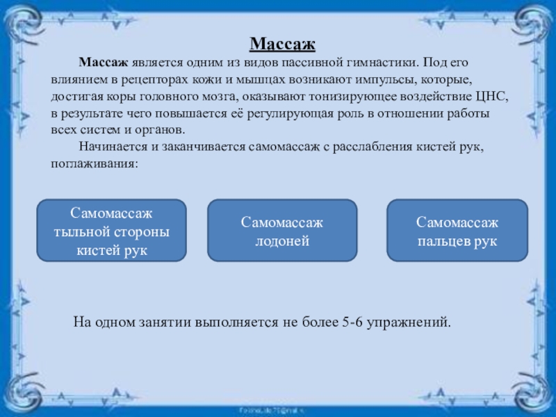 Массаж является одним из видов пассивной гимнастики. Под его влиянием в