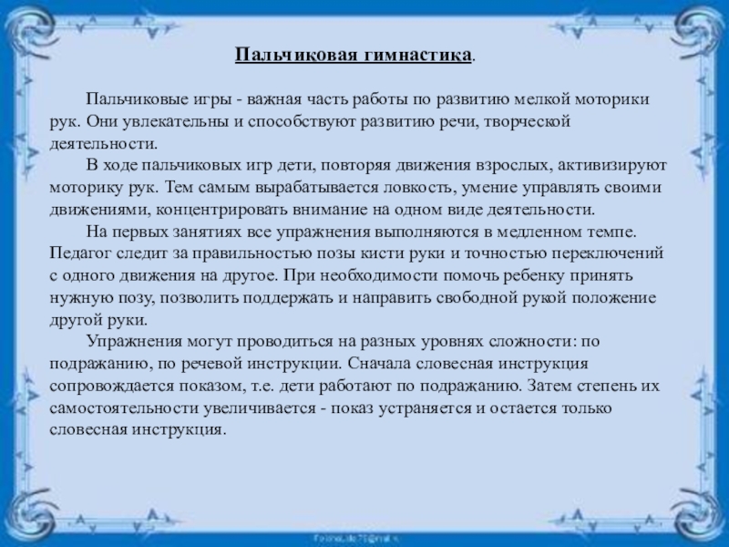 На первых занятиях все упражнения выполняются в медленном темпе. Педагог следит за правильностью позы кисти руки и точностью переключений с одного движения на другое. При необходимости помочь ребенку принять нужную позу, позволить поддержать и направить свободной рукой положение другой руки.