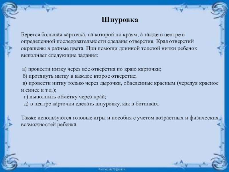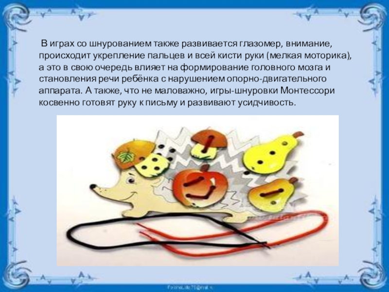 Слайд 13 В играх со шнурованием также развивается глазомер, внимание, происходит укрепление