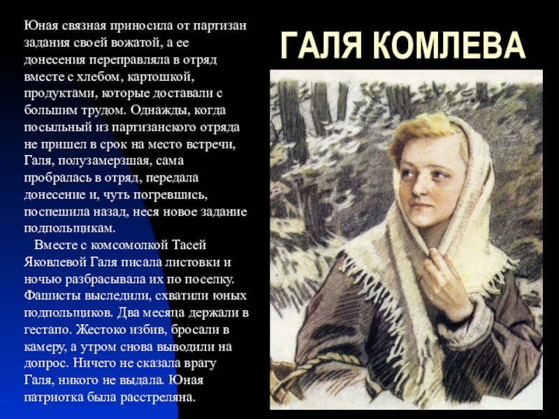 донесения переправляла в отряд вместе с хлебом, картошкой, продуктами, которые доставали с большим трудом. Однажды, когда посыльный из партизанского отряда не пришел в срок на место встречи, Галя, полузамерзшая, сама пробралась в отряд, передала донесение и, чуть погревшись, поспешила назад, неся новое задание подпольщикам.