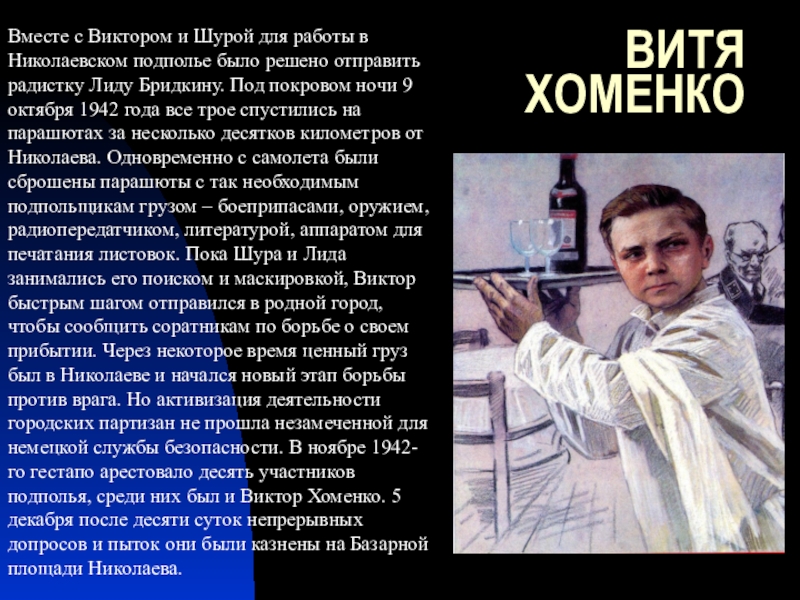 было решено отправить радистку Лиду Бридкину. Под покровом ночи 9 октября 1942 года все трое спустились на парашютах за несколько десятков километров от Николаева. Одновременно с самолета были сброшены парашюты с так необходимым подпольщикам грузом – боеприпасами, оружием, радиопередатчиком, литературой, аппаратом для печатания листовок. Пока Шура и Лида занимались его поиском и маскировкой, Виктор быстрым шагом отправился в родной город, чтобы сообщить соратникам по борьбе о своем прибытии. Через некоторое время ценный груз был в Николаеве и начался новый этап борьбы против врага. Но активизация деятельности городских партизан не прошла незамеченной для немецкой службы безопасности. В ноябре 1942-го гестапо арестовало десять участников подполья, среди них был и Виктор Хоменко. 5 декабря после десяти суток непрерывных допросов и пыток они были казнены на Базарной площади Николаева.