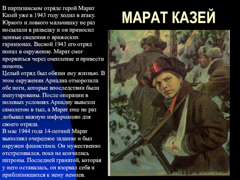 ходил в атаку. Юркого и ловкого мальчишку не раз посылали в разведку и он приносил ценные сведения о вражеских гарнизонах. Весной 1943 его отряд попал в окружение. Марат смог прорваться через оцепление и привести помощь.