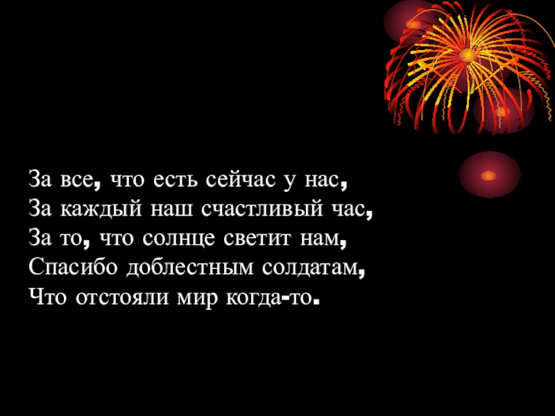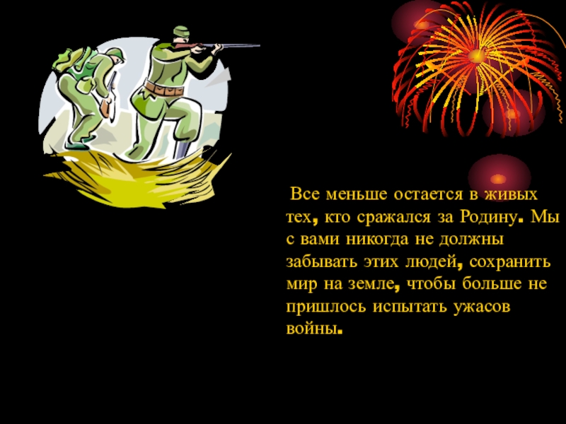 Родину. Мы с вами никогда не должны забывать этих людей, сохранить мир на земле, чтобы больше не пришлось испытать ужасов войны.