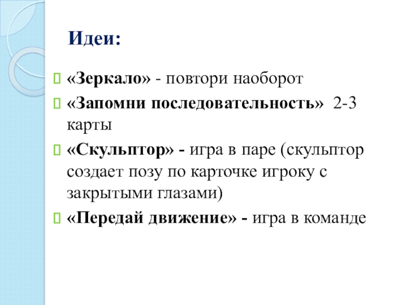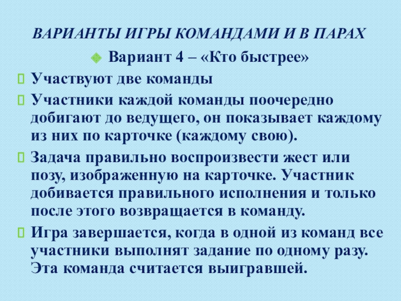 Задача правильно воспроизвести жест или позу, изображенную на карточке. Участник добивается правильного исполнения и только после этого возвращается в команду.