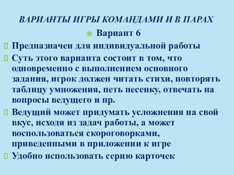 этого варианта состоит в том, что одновременно с выполнением основного задания, игрок должен читать стихи, повторять таблицу умножения, петь песенку, отвечать на вопросы ведущего и пр.