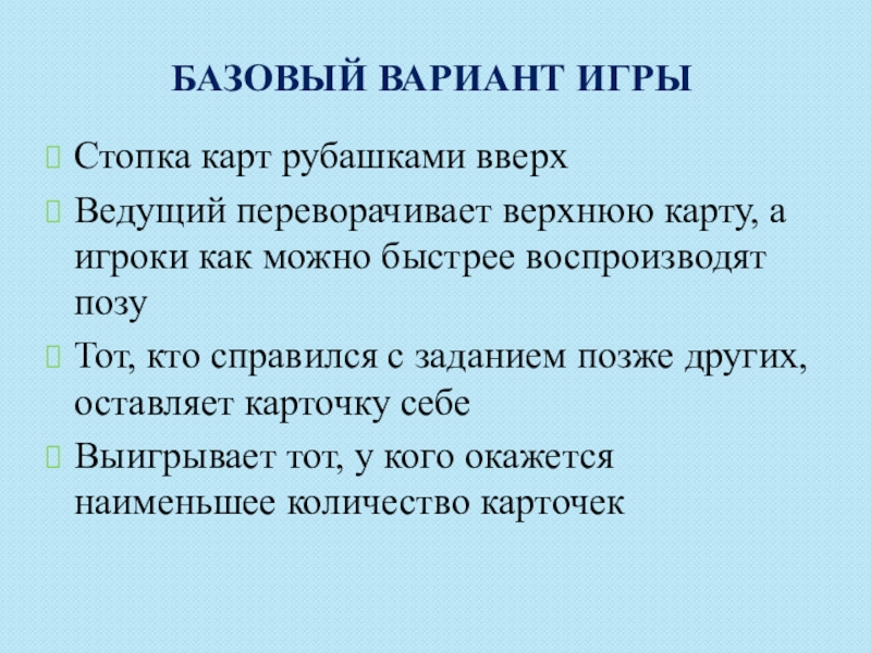 Важно: чем больше карточек, тем сложнее выбор; игроки и ведущий должны располагаться в один ряд.