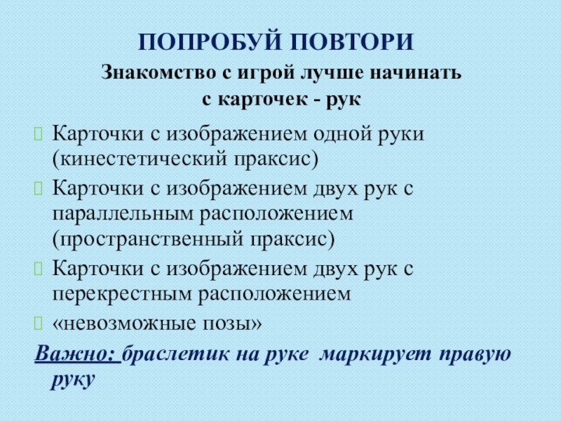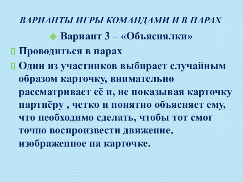 из участников выбирает случайным образом карточку, внимательно рассматривает её и, не показывая карточку партнёру , четко и понятно объясняет ему, что необходимо сделать, чтобы тот смог точно воспроизвести движение, изображенное на карточке.