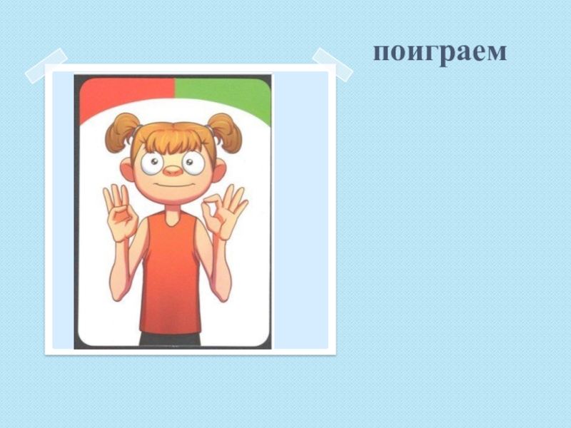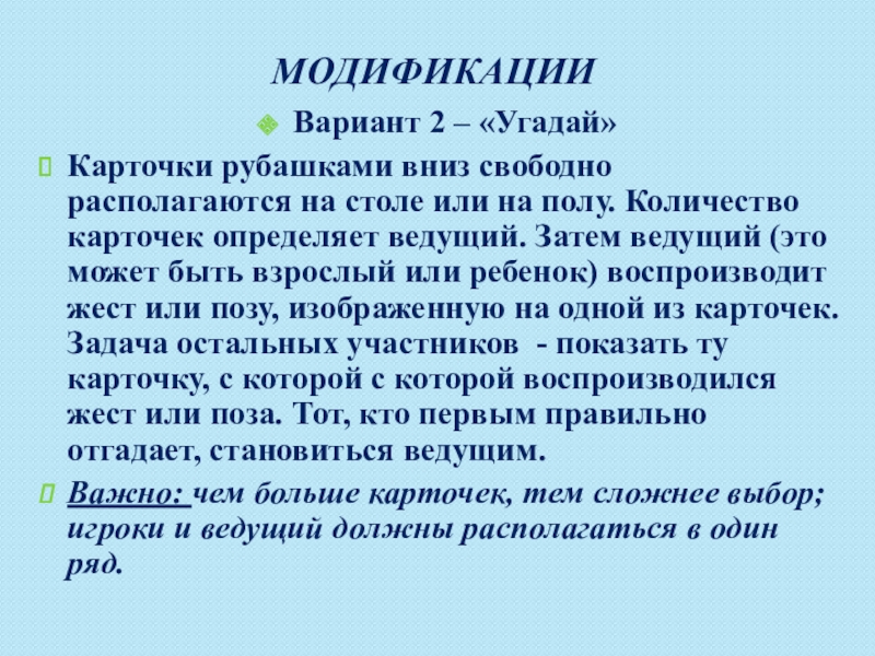 на полу. Количество карточек определяет ведущий. Затем ведущий (это может быть взрослый или ребенок) воспроизводит жест или позу, изображенную на одной из карточек. Задача остальных участников - показать ту карточку, с которой с которой воспроизводился жест или поза. Тот, кто первым правильно отгадает, становиться ведущим.