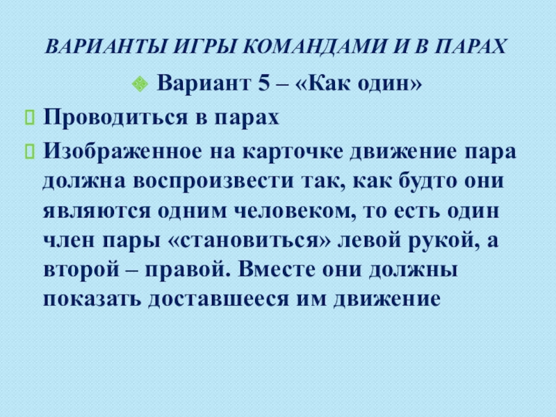 Изображенное на карточке движение пара должна воспроизвести так, как будто они являются одним человеком, то есть один член пары «становиться» левой рукой, а второй – правой. Вместе они должны показать доставшееся им движение
