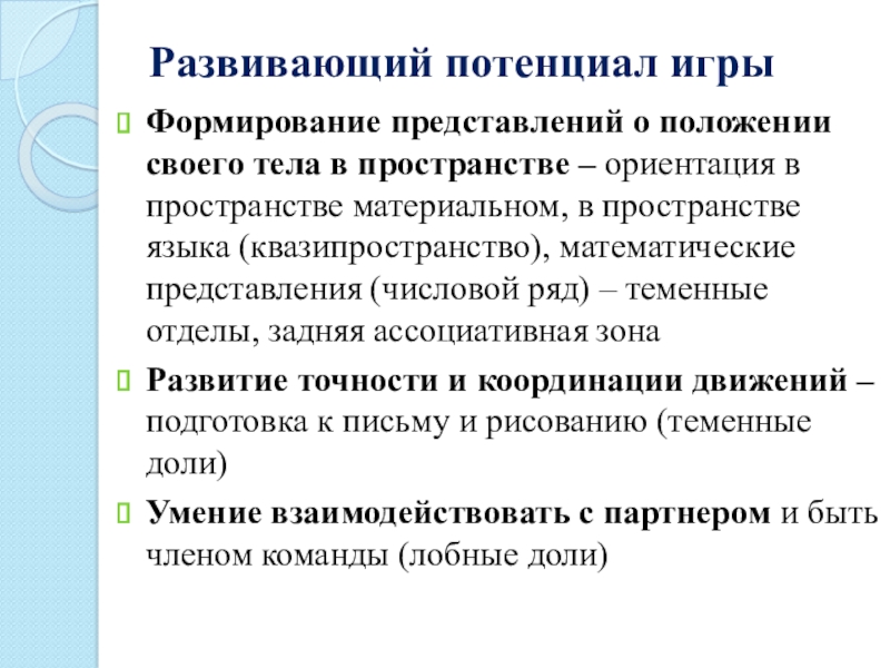 ориентация в пространстве материальном, в пространстве языка (квазипространство), математические представления (числовой ряд) – теменные отделы, задняя ассоциативная зона
