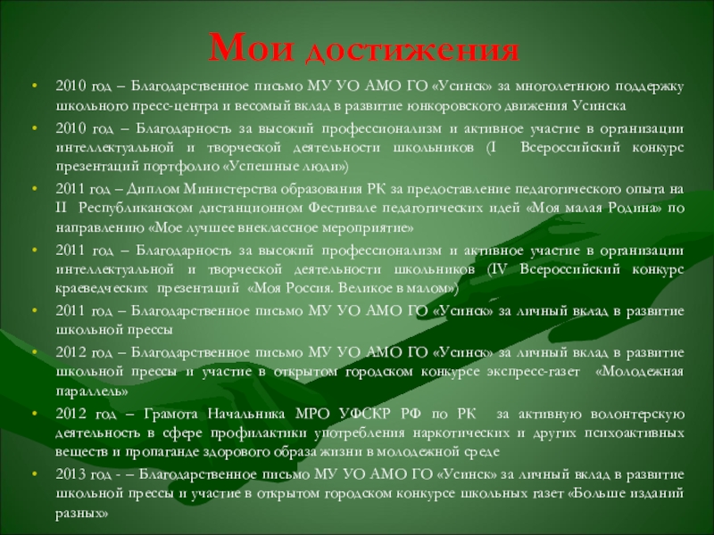 2011 год – Благодарственное письмо МУ УО АМО ГО «Усинск» за личный вклад в развитие школьной прессы