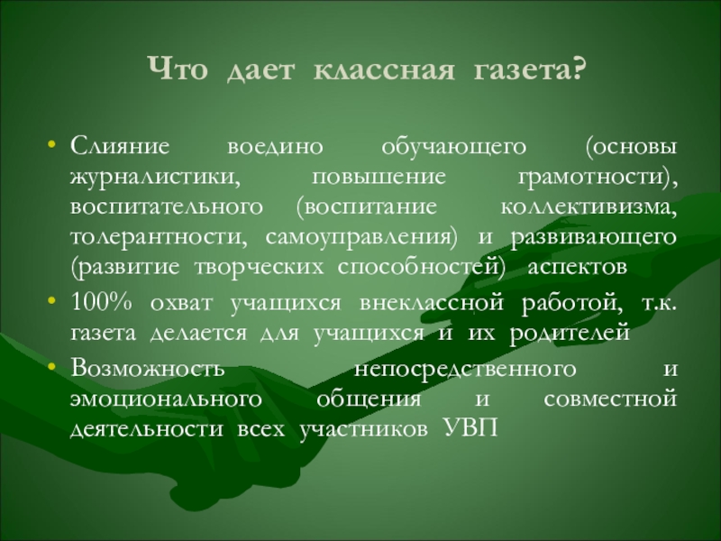 Слияние воедино обучающего (основы журналистики, повышение грамотности), воспитательного
