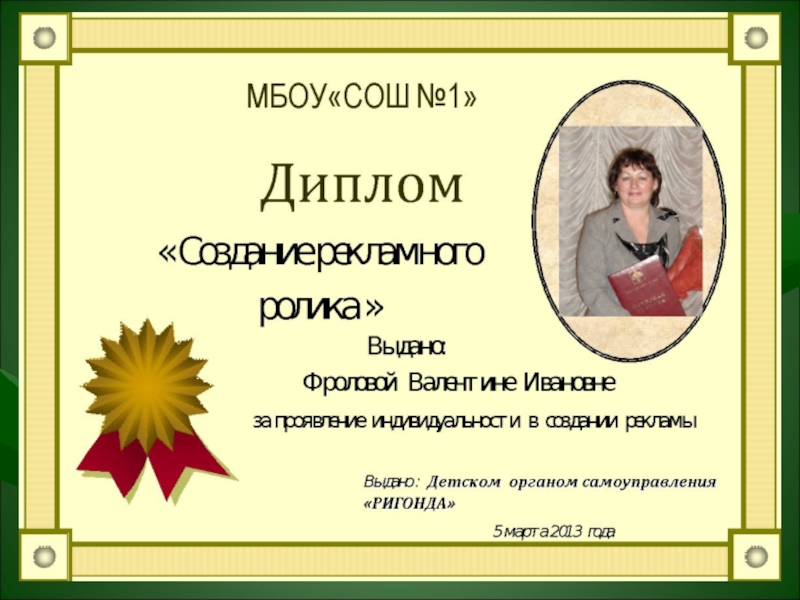 2010 год – Благодарность за высокий профессионализм и активное участие в организации интеллектуальной и творческой деятельности школьников (I Всероссийский конкурс презентаций портфолио «Успешные люди»)