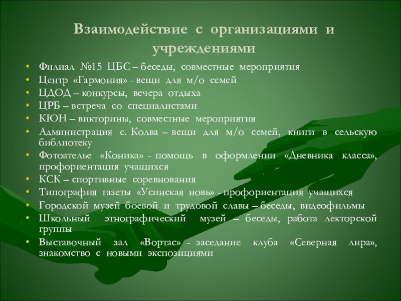 Слайд 8Взаимодействие с организациями и учреждениями