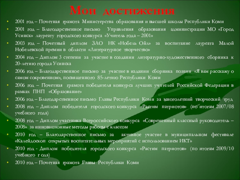 2001 год – Благодарственное письмо Управления образования администрации МО «Город Усинск» лауреату городского конкурса «Учитель года – 2001»