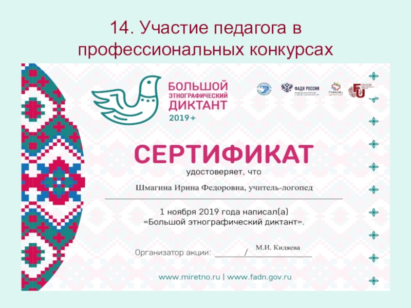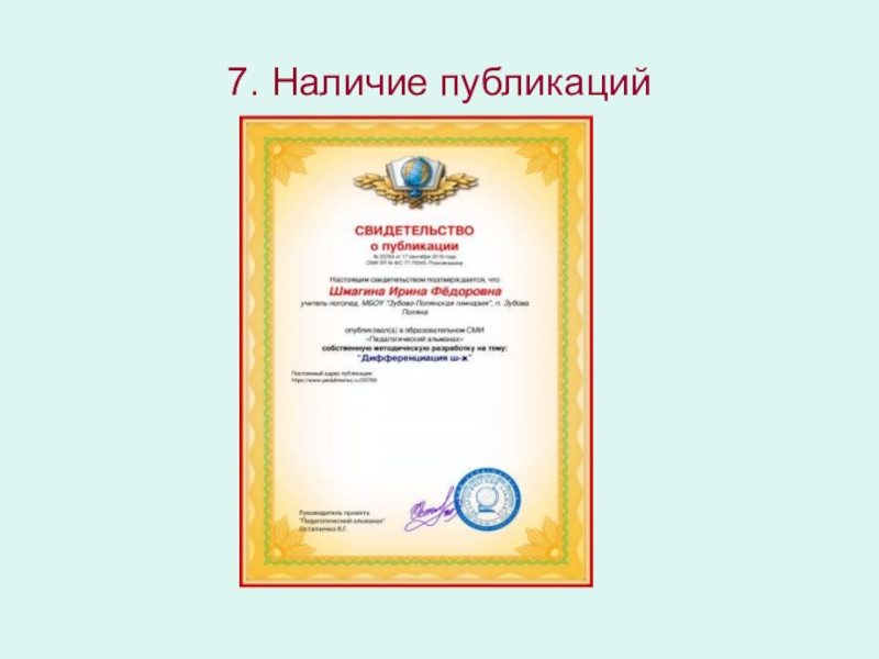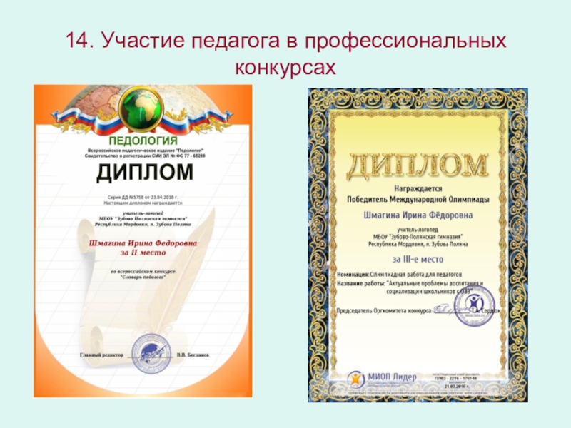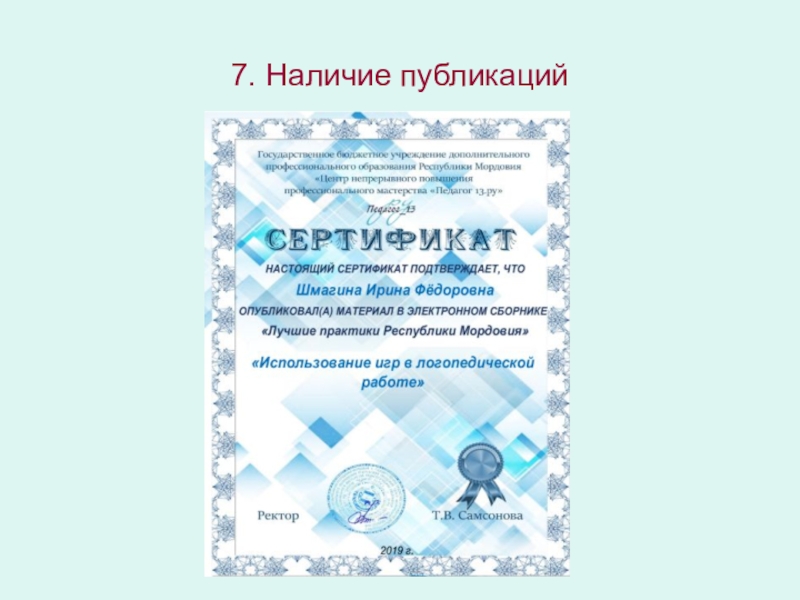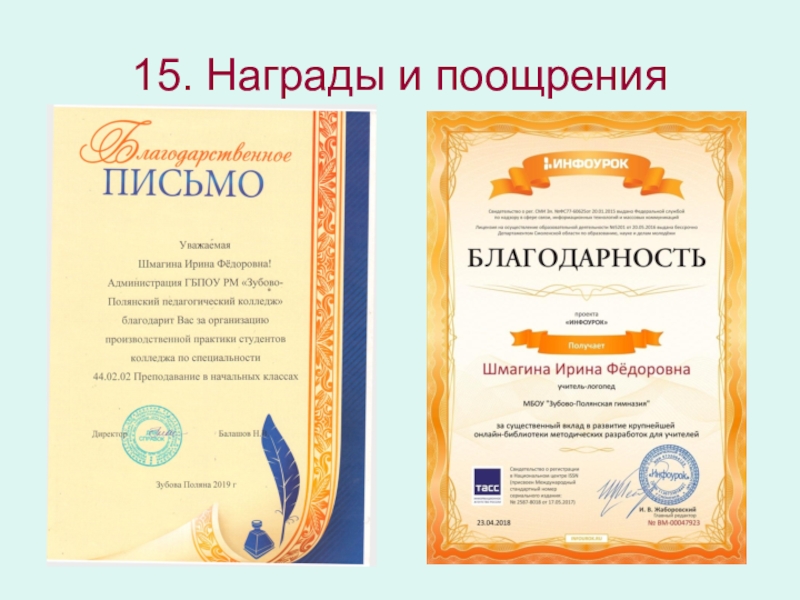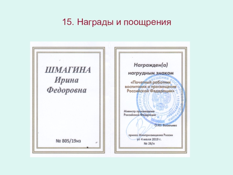 Звание: Почетный работник воспитания и просвещения Российской Федерации, приказ Министерства России от 4 июля 2019г №28/н