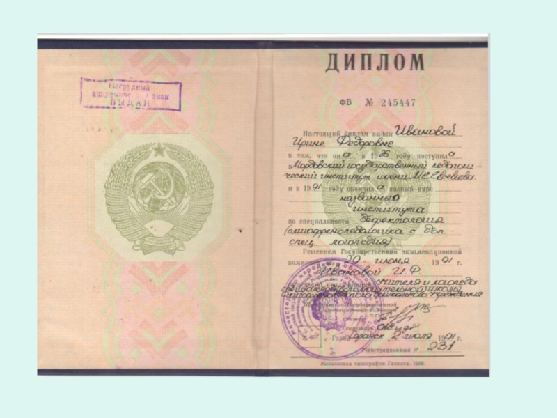 ФВ № 245447 от 29.06.1991 г., учитель и логопед специальной(вспомогательной) школы, олигофренопедагог дошкольного учреждения