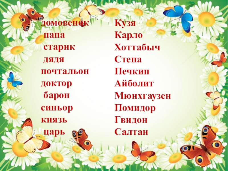 домовенок папа старик дядяпочтальондоктор барон синьоркнязь царь  КузяКарлоХоттабыч СтепаПечкинАйболитМюнхгаузен ПомидорГвидон Салтан