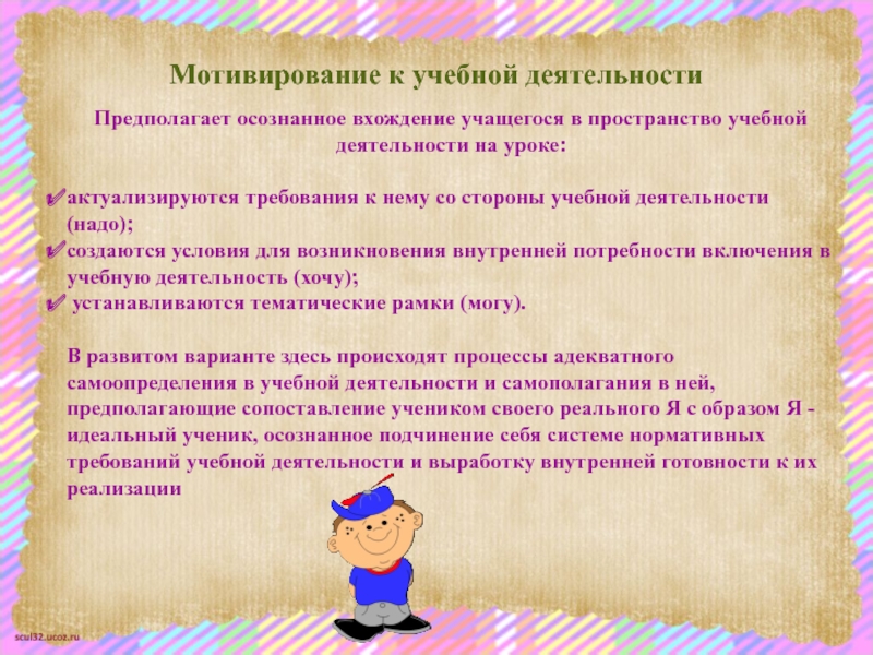Предполагает осознанное вхождение учащегося в пространство учебной деятельности