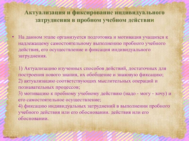 этапе организуется подготовка и мотивация учащихся к надлежащему самостоятельному выполнению пробного учебного действия, его осуществление и фиксация индивидуального затруднения.