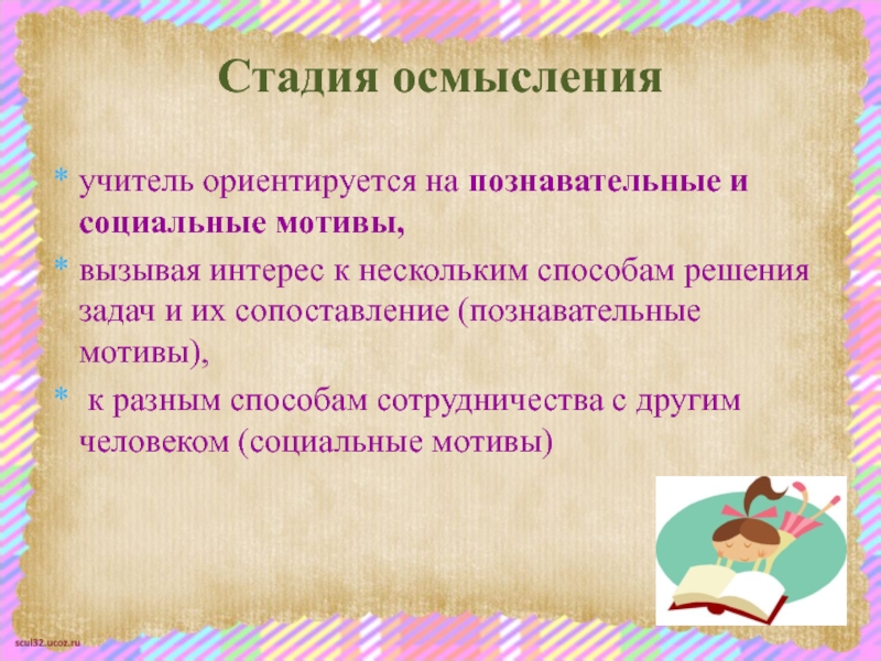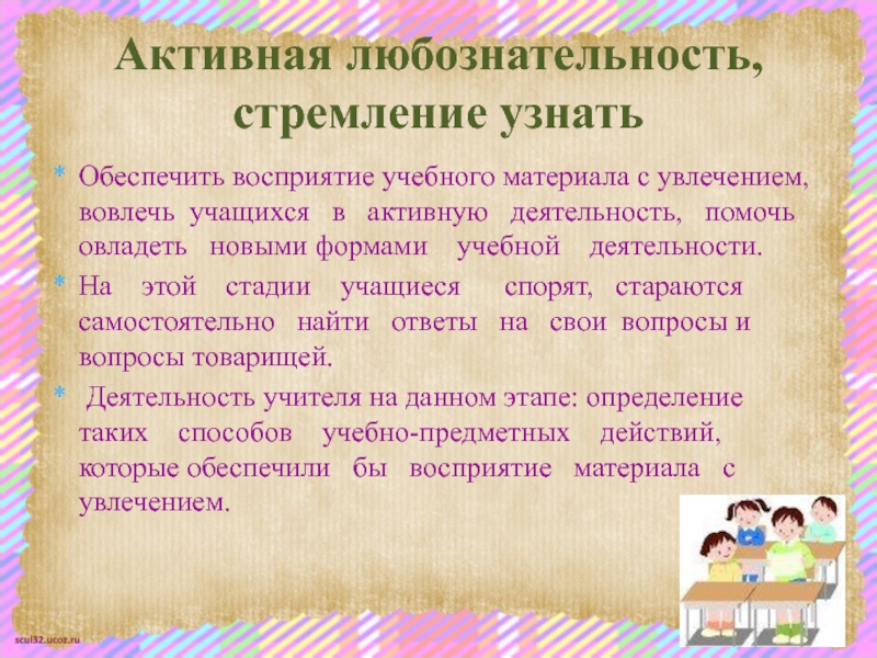 Деятельность учителя на данном этапе: определение таких способов учебно-предметных действий, которые обеспечили бы восприятие материала с увлечением.