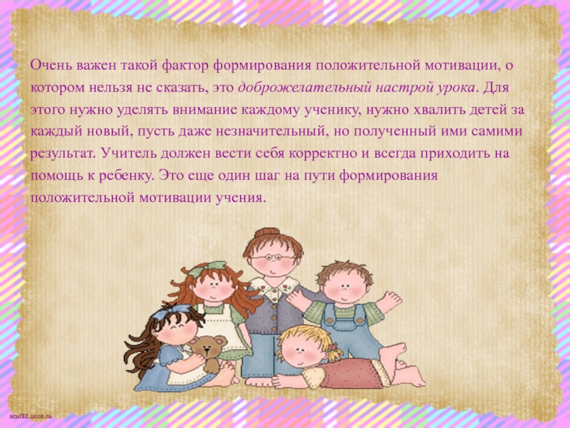 сказать, это доброжелательный настрой урока. Для этого нужно уделять внимание каждому ученику, нужно хвалить детей за каждый новый, пусть даже незначительный, но полученный ими самими результат. Учитель должен вести себя корректно и всегда приходить на помощь к ребенку. Это еще один шаг на пути формирования положительной мотивации учения.