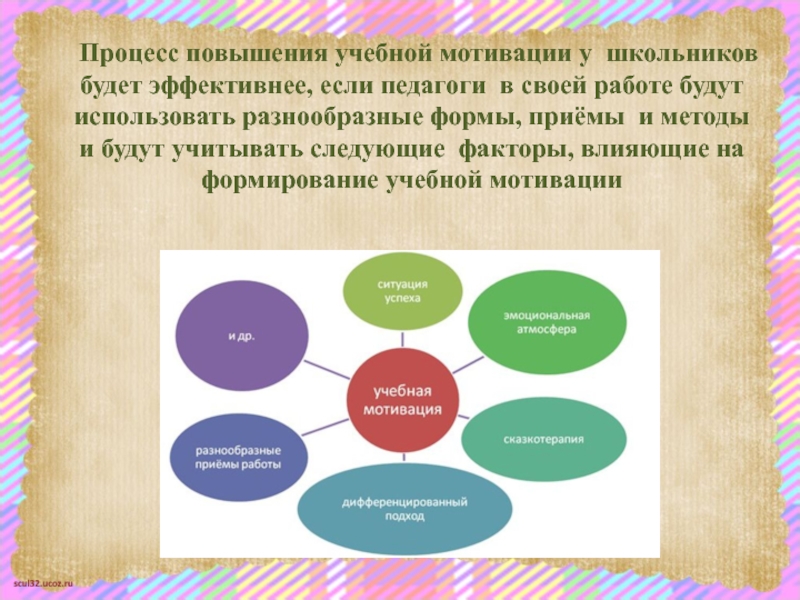 своей работе будут использовать разнообразные формы, приёмы и методы и будут учитывать следующие факторы, влияющие на формирование учебной мотивации