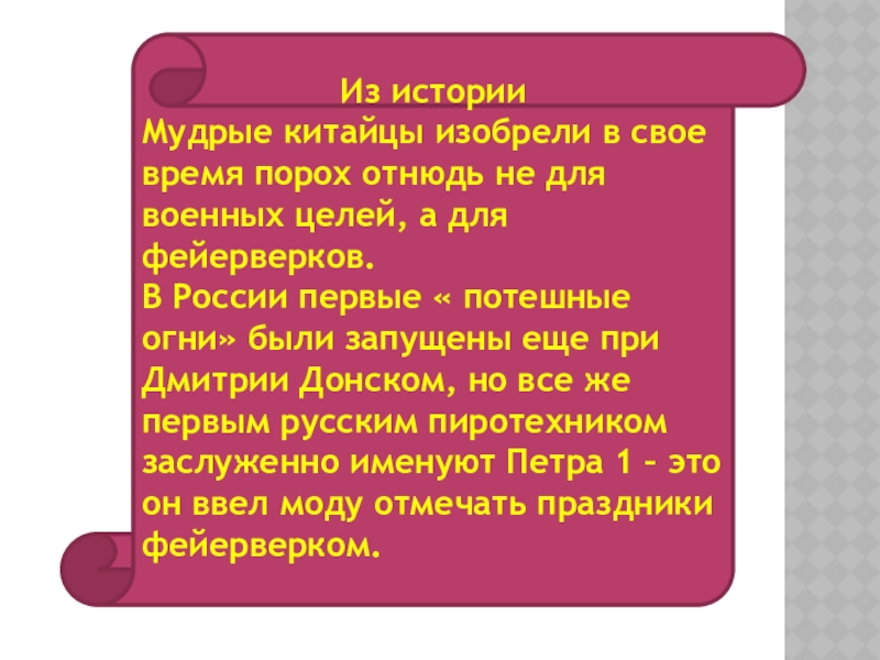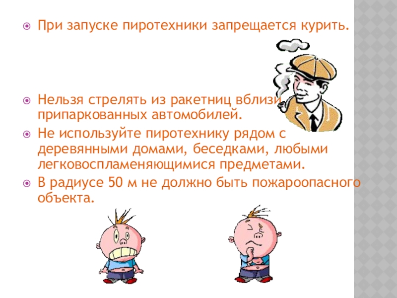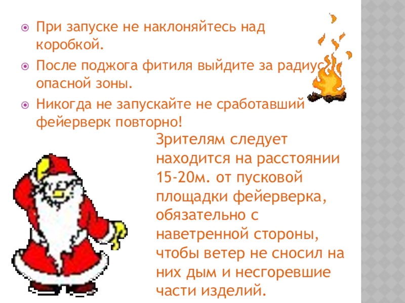 Зрителям следует находится на расстоянии 15-20м. от пусковой площадки фейерверка, обязательно с наветренной стороны, чтобы ветер не сносил на них дым и несгоревшие части изделий.