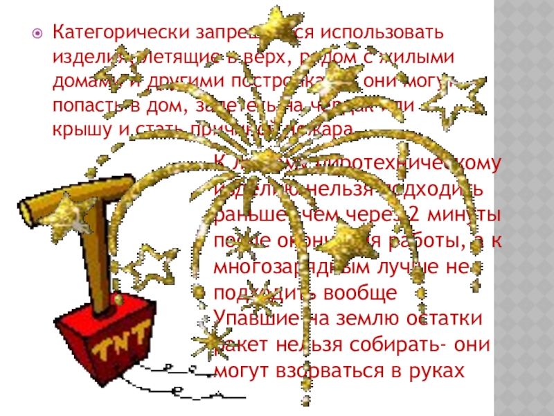 К любому пиротехническому изделию нельзя подходить раньше, чем через 2 минуты после окончания работы, а к многозарядным лучше не подходить вообще