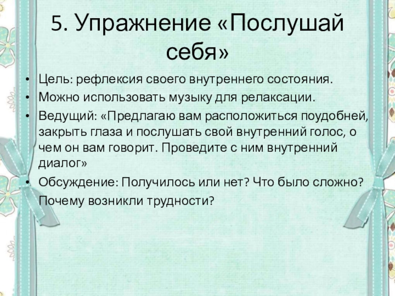 Ведущий: «Предлагаю вам расположиться поудобней, закрыть глаза и послушать свой внутренний голос, о чем он вам говорит. Проведите с ним внутренний диалог»