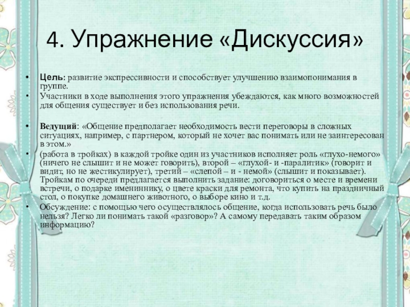 (работа в тройках) в каждой тройке один из участников исполняет роль «глухо-немого» (ничего не слышит и не может говорить), второй – «глухой- и -паралитик» (говорит и видит, но не жестикулирует), третий – «слепой – и - немой» (слышит и показывает). Тройкам по очереди предлагается выполнить задание: договориться о месте и времени встречи, о подарке имениннику, о цвете краски для ремонта, что купить на праздничный стол, о покупке домашнего животного, о выборе кино и т.д.