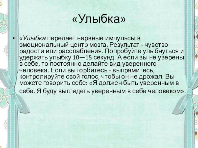 радости или расслабления. Попробуйте улыбнуться и удержать улыбку 10—15 секунд. А если вы не уверены в себе, то постоянно делайте вид уверенного человека. Если вы горбитесь - выпрямитесь, контролируйте свой голос, чтобы он не дрожал. Вы можете говорить себе: «Я должен быть уверенным в себе. Я буду выглядеть уверенным в себе человеком».