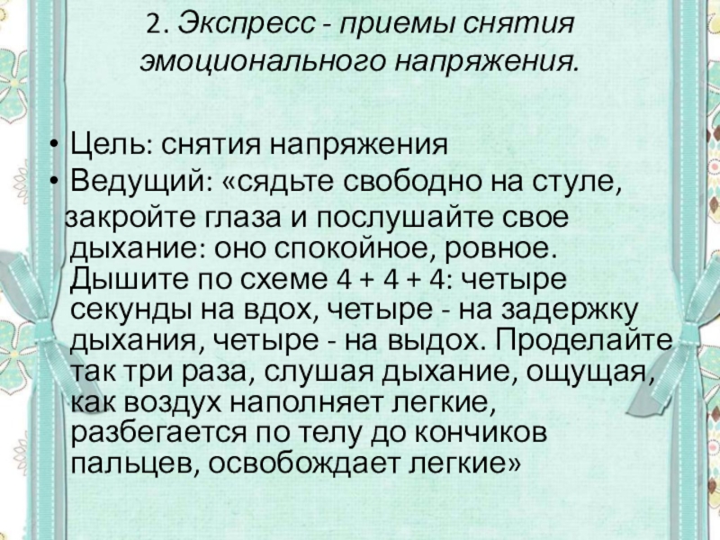 Слайд 52. Экспресс - приемы снятия эмоционального напряжения.