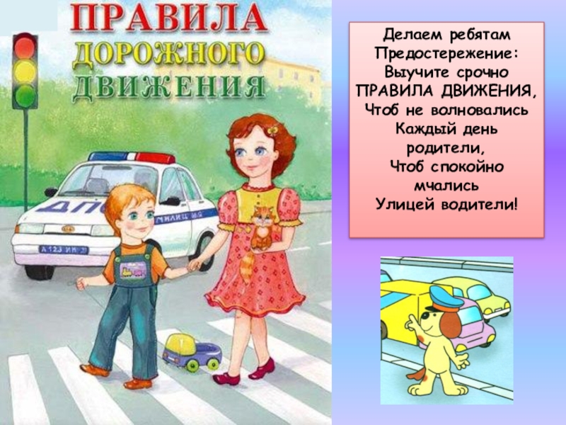 Делаем ребятам Предостережение:Выучите срочноПРАВИЛА ДВИЖЕНИЯ,Чтоб не волновалисьКаждый день родители,Чтоб спокойно мчалисьУлицей водители!