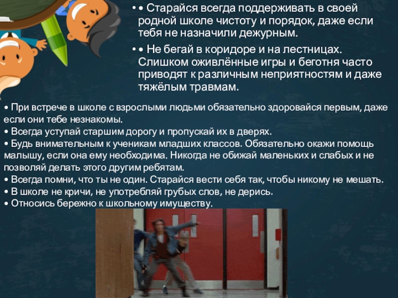 • Не бегай в коридоре и на лестницах. Слишком оживлённые игры и беготня часто приводят к различным неприятностям и даже тяжёлым травмам.