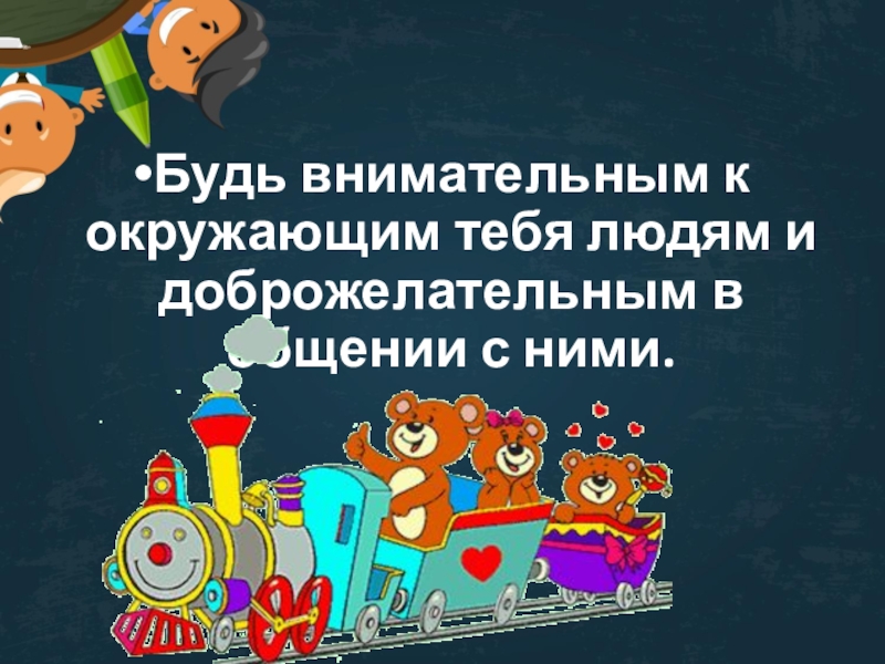 Слайд 10Будь внимательным к окружающим тебя людям и доброжелательным в общении с