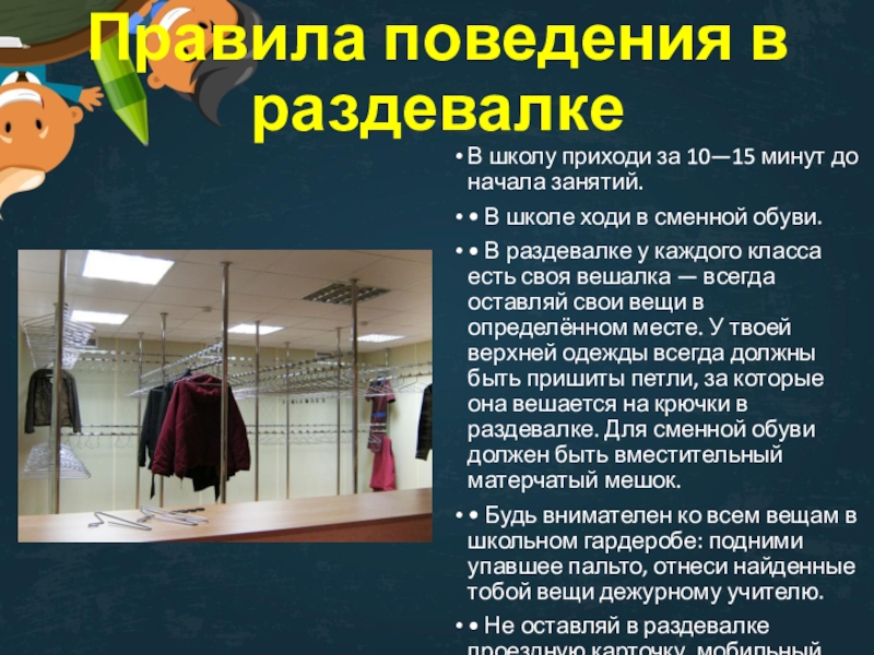 • Будь внимателен ко всем вещам в школьном гардеробе: подними упавшее пальто, отнеси найденные тобой вещи дежурному учителю.