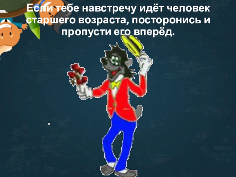 Слайд 22Если тебе навстречу идёт человек старшего возраста, посторонись и пропусти его