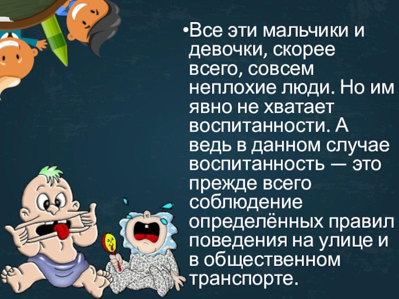 им явно не хватает воспитанности. А ведь в данном случае воспитанность — это прежде всего соблюдение определённых правил поведения на улице и в общественном транспорте.