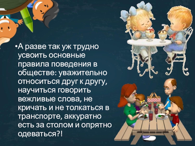 Слайд 5А разве так уж трудно усвоить основные правила поведения в обществе: