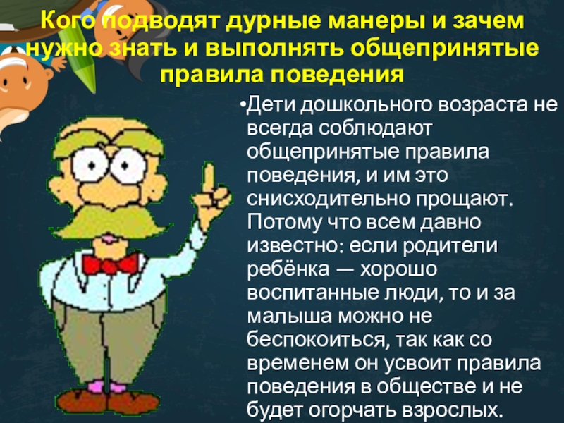 Дети дошкольного возраста не всегда соблюдают общепринятые правила поведения, и им это снисходительно прощают. Потому что всем давно известно: если родители ребёнка — хорошо воспитанные люди, то и за малыша можно не беспокоиться, так как со временем он усвоит правила поведения в обществе и не будет огорчать взрослых.