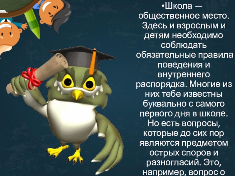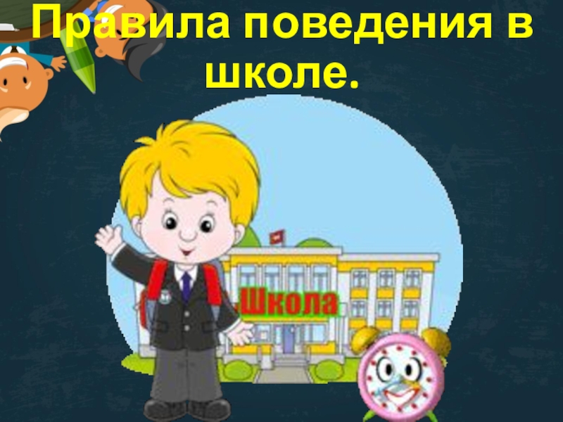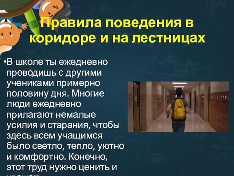 Слайд 25Школа — общественное место. Здесь и взрослым и детям необходимо соблюдать