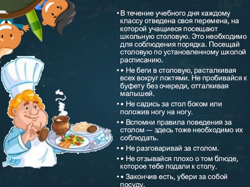 учащиеся посещают школьную столовую. Это необходимо для соблюдения порядка. Посещай столовую по установленному школой расписанию.