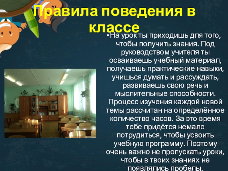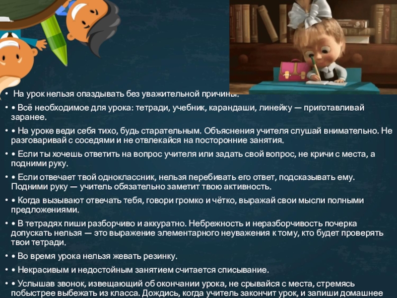 • На уроке веди себя тихо, будь старательным. Объяснения учителя слушай внимательно. Не разговаривай с соседями и не отвлекайся на посторонние занятия.